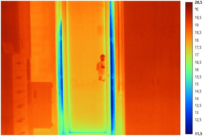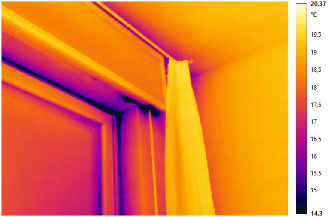 Nell’immagine sopra si rendono evidenti con termografia infrarossa delle problematiche legate ad una scarsa coibentazione al nodo telaio/falso telaio e una infiltrazione di aria dalla zona di passaggio della cinghia della tapparella avvolgibile.