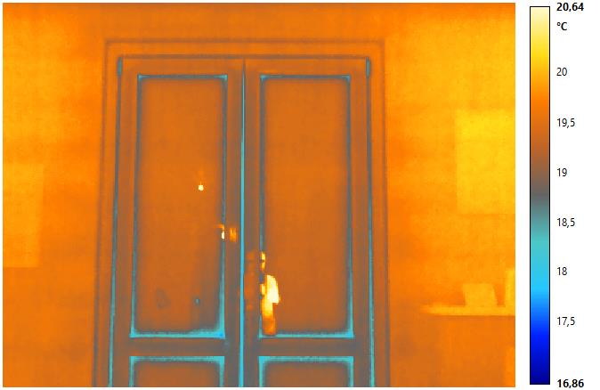Nel termogramma qui sopra si può vedere un serramento con evidenti problematiche di tenuta dell’anta.