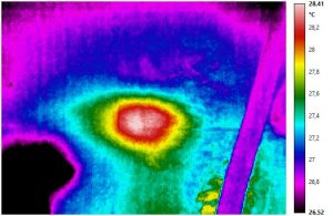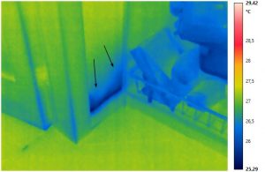 Nei soprastanti termogrammi si notano: a sinistra una anomalia termica a temperatura superficiale apparente maggiore, situata sopra il tubo di adduzione dell’acqua calda, con gradiente termico in diminuzione dal centro verso la periferia; si sospetta una perdita. Nel termogramma a destra si possono vedere gli effetti di detta perdita; la zona indicata dalle frecce, a temperatura superficiale apparente inferiore rispetto al resto della muratura, è umidità sparsa nel massetto sottopavimento assorbita dalla muratura nei pressi della zona di perdita.