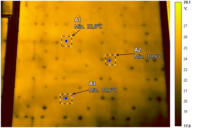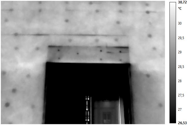 • verifica della corretta esecuzione dei dettagli costruttivi ed eliminazione dei ponti termici Nelle immagini alcuni esempi di problematiche riscontrate in indagini effettuate su cappotti in EPS, come carenza di tasselli, fughe tra pannelli troppo larghe e riempite con malta, differenza di temperatura tra tasselli troppo elevata, sintomo di tasselli incassati e con presenza di malta.Nell’immagine successiva è invece possibile notare alcuni problemi legati a dispersioni termiche da pannelli in lana di roccia a causa di una non corretta esecuzione del fissaggio degli stessi.